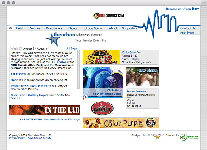*note: The UrbanStarr is no longer operational after a successful 7 year run (2002 - 2008). In that 7 years, The UrbanStarr underwent two redesigns. The link below represents a limited version of the most recent design without database functionality. The 'Events', 'Venues', & 'Restaurants' pages do not work due to database requirements.