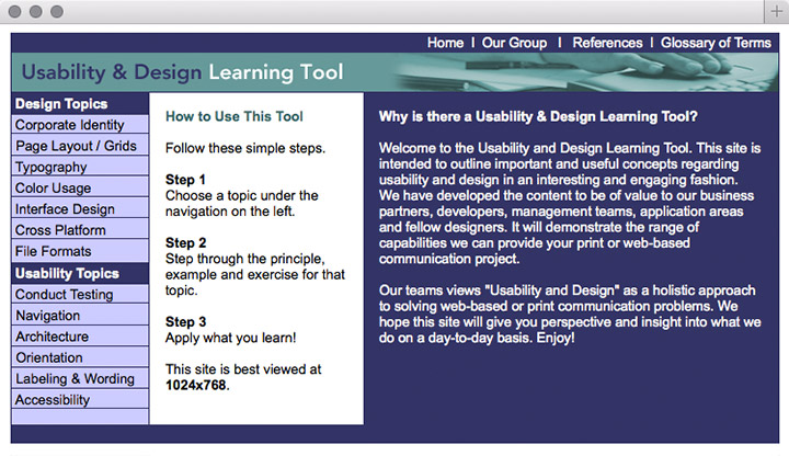 The need for a vehicle to inform co-workers of important usability and design concepts sparked the development of the U&D Learning Tool at Nationwide. We needed to demonstrate these concepts in an interesting and engaging manner that would stay away from pages upon pages of boring text-based content. The concepts were broken down into topics and lessons which featured a principle, an example, and an exercise. They were developed using Flash as the exercises were completely interactive. 2002